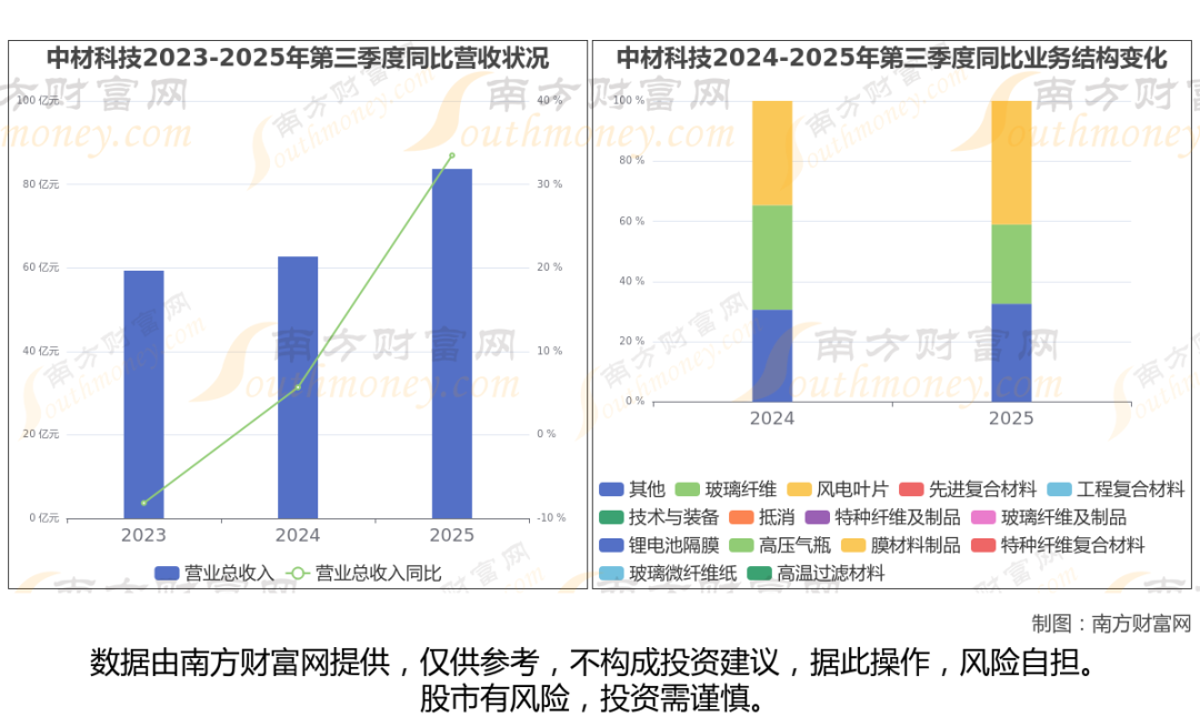 于2025年第三季度,中材科技披露了其业绩表现(如上图),其中主营业务收入83.69亿元,相较于去年同期33.47%。