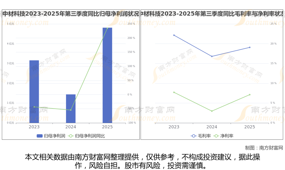 2025年第三季度季报显示,中材科技公司实现净利润4.81亿,同比上年增长率为234.84%,毛利率19.07%,归属净利润4.81亿,同比增长234.84%。