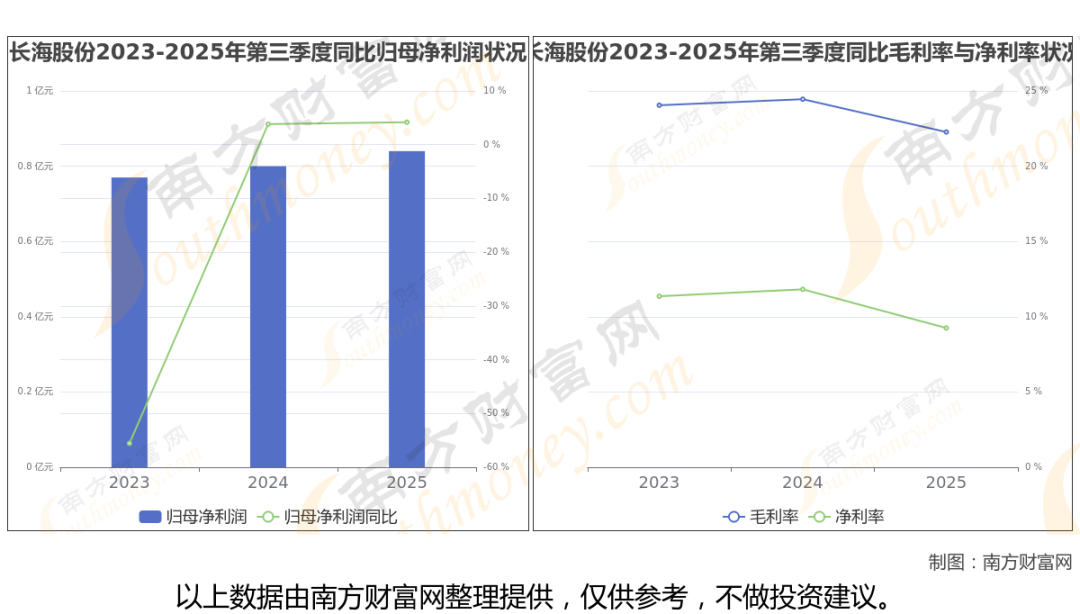 2025年第三季度季报显示,长海股份公司毛利率22.27%,净利率9.25%,归属净利润8376.83万,同比增长4.18%。