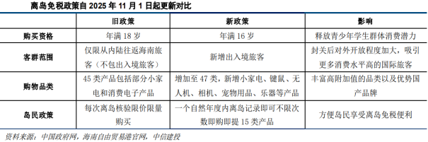 海南离岛免税政策调整,已于11月1日起实施,具体调整包括:扩大离岛免税商品范围:增加宠物用品、可随身携带的乐器、微型无人机、小家电等商品。离岛免税商品由45大类提高至47大类;允许服装服饰、鞋帽、陶瓷制品、丝巾、咖啡、茶等国内商品进入离岛免税店销售,退(免)增值税、消费税;将离岛免税购物年龄由年满16周岁调整为年满18周岁;允许离境旅客享受离岛免税政策,离岛且离境旅客购买离岛免税商品计入其每年10万元免税购物额度,不限次数;对一个自然年度内有离岛记录的岛内居民,在本自然年度内可按“即购即提”提货方式要求,不限次数购买离岛免税商品;此次调整符合前期预计海南正式封关后将逐步扩大免税商品范围和拓展国货数量的预期,增强免税运营商自身渠道品牌价值和优质全球商品发现能力,预计有利于提升免税作为高端零售渠道的稀缺性,并有助于拓展消费者覆盖范围和客单价;部分国内商品进入免税店并退(免)消费税、增值税可能更具价格优势(目前入境退税主要退增值税);新增允许离岛且离境旅客享受离岛免税政策(原先离岛范围不包括离境);针对岛民的免税政策预计将有力提升消费额。原先规定为岛内居民离岛前购买免税品,可选择返岛提取,返岛提取免税品时须提供本人有效身份证件和实际离岛行程信息,提取需购买后3个月内完成,更偏向每次行程一次性购物,每次提取需要与离岛返岛行程匹配。而政策调整后年内只需一次离岛记录,就可按照“即购即提”方式不限次购买免税商品,可大幅提升岛民购买便利性。五部委发布完善免税政策,积极提振消费。10月30日财政部为主的五部委共同发布《完善免税政策支持提振消费通知》,通知提及引导消费回流,外加吸引入境消费,对具体政策,归纳为以下五个方面:鼓励加大采购国产商品(文创、非遗),视同出口,国内商品优化出口报关和退税流程。预计可以简化流程,降低成本;口岸 市内免税店国产品经营面积不少于25%,学习韩国,为国产品牌提供更多展示空间;扩大品类到手机、微型无人机、运动用品、保健食品、非处方药、宠物食品等商品。电子产品可以迅速扩大销售规模,保健品、宠物用品等高毛利率产品可以优化结构,缓解香化价格竞争压力;免税店审批权限下放到省一级,经营面积可与经营主体协商再报海关,展业流程更加流畅;支持提供线上预订、线下提货。支持市内店预订后在出境再入境后时的入境口岸付款提货,视同入境免税店购买(限同一城市),为市内免税店打开空间。目前机场免税店的销售恢复明显弱于出入境客流,或主要是因为原先的口岸免税店主要针对的是中国本土游客出入境需求,购买以国际品牌香化奢侈品为主,但是伴随品牌在抖音、天猫等渠道的激烈价格竞争,对国内香化价格体系造成长期扰动,免税的价格优势大幅削弱。但是对于入境外国旅客而言,国内电商的比较优势不能发挥作用,且目前政策鼓励的是引入国产品牌和新的消费品类,这有助于中国口岸和市内免税店将销售结构逐步调整到以外国游客为主,进而实现新的增长。资生堂、爱茉莉等国际香化品牌也是伴随日韩免税渠道漂洋过海,打开全球市场空间。由于国际旅行的体验无法被线上取代,因此线下免税店作为入境旅游经济发展中至关重要的流量变现枢纽,其长期商业价值将再次被深度挖掘。2、封关后离岛免税依旧是经济支柱,出入境迎接国货出海时代全岛封关与离岛免税共存,免税运营商做好充足准备。2025年12月18日,海南自贸港全岛封关将正式启动。封关运作后,海南将实施以“‘一线’放开、‘二线’管住、岛内自由”为基本特征的自由化便利化政策制度。海关总署与海口海关已陆续发布多项配套制度,涵盖税收征管、通关监管、风险防控等环节,形成以“精准施策、创新监管、智慧信用、协同共管”为特点的监管体系。目前的封关政策更多针对的是进出口和制造业,即实施更加优惠的货物“零关税”政策。目前“一线”进口的“零关税”商品税目比例将由21%提高至74%,在岛内享惠主体之间可以免进口税收流通,加工增值达到30%的可免关税销往内地。这方面的“免税”政策与实际消费相关度较低,与离岛免税不相关。岛民免税目前的品类预计和离岛免税有一定差异,且目前研究方案是将多种税收集合为销售税(类似日本、新加坡的消费税模式),因此在核心品类上也会与离岛免税有一定价格差距。在购物方式上,离岛免税对于进出海南客户依旧需要对消费资格和提货方式进行特殊规定,岛民免税虽然可能同样减免一些税费,但是考虑到防止走私串货等行径,必然会匹配相应的监管措施。游客和本地居民的需求将会逐渐分化对应不同政策。根据目前海南省政府的规划,海南封关后目标依旧是加快建设国际旅游消费中心。一方面,加快打造独具影响力的文旅消费新场景。将建设一批国际文旅IP和项目,并且同时推进现有的景区景点焕新升级,为游客提供更加丰富多元的旅游体验。另一方面,进一步营造安心、放心、开心、舒心的旅游消费环境。海南省2024年社零总额为2406亿元,而海南离岛免税经营主体销售额470.3亿元(离岛免税部分为309.4亿元),离岛免税在海南经济中一直占有举足轻重的地位,因此,近期海南省出台了离岛免税岛民即买即提的优惠政策也凸显了鼓励态度:从海南的游客结构可以看出