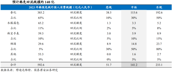 新增购物场景:国人出境前60日内可在市内免税店购物。此前市内免税门店以服务出境境外人士及归国居民为主,其中,出境境外人士于机场提货点提货,归国居民免税政策规定时间限制为入境180天内,市内免税店现场可提货。新的市内免税店政策允许即将于60日(含)内出境的旅客(包括不限于中国籍旅客)在即将离境口岸所属城市的市内免税店购物,并于口岸提货点提取免税商品且一次性携带出境。提高消费限额:市内免税店购买免税商品不设购物限额,仍须满足入境8000元限额。此前,出境境外人士的市内免税消费不限额;归国居民免税政策规定选购额度为5000元。新政策不设市内免税购物限额,但应符合海关对于进境物品管理的规定,与境外购物合计免税限额8000元。增设免税门店:现有门店转型,新增8个城市各设1家门店。新政策规定中国中免旗下6家市内免税店适用新办法;中服旗下12家和港中旅旗下1家共13家外汇商品免税店,自10月1日起3个月内转型为市内免税店,经海关验收合格后开业;在广州、成都、深圳、天津、武汉、西安、长沙和福州等8个城市,各设立1家市内免税店。丰富销售品类:鼓励销售国货“潮品”。市内免税店主要销售食品、服装服饰、箱包、鞋帽、母婴用品、首饰和工艺品、电子产品、香化产品、酒等便于携带的消费品,同时鼓励市内免税店销售国货“潮品”。消费回流是不变的主题,免税业任重道远。我国政府多年来不断推出扩大内需、优化国内消费供给的相关政策,促进国内市场需求升级和供给能力不断提升,加快消费回流。2022年12月,中共中央、国务院印发《扩大内需战略规划纲要(2022-2035年)》,免税单独一段,纲要提出:更好满足中高端消费品消费需求,促进免税业健康有序发展,促进民族品牌加强同国际标准接轨,充分衔接国内消费需求,增加中高端消费品国内供应;培育建设国际消费中心城市,打造一批区域消费中心,深入推进海南国际旅游消费中心建设。支持免税行业发展对扩大我国消费需求具备重要战略意义。实现消费回流的路径中,第一步在于渠道的转换:在国内渠道,消费国外产品——拉动我国零售业、旅游业发展;第二步在于国货的崛起:在国内渠道,消费国内产品——拉动我国零售业、旅游业及上游香化、服装等行业发展。渠道转换是消费回流的第一步,实现第二步需要的时间维度更长。作为承接消费回流的下一步重点,相比口岸免税,市内免税在提升消费者购物体验、支持非标品购买、提高免税商盈利能力等方面具备显著优势。提升消费者购物体验。市内店空间更大、产品种类更多。口岸免税店面积受制于口岸面积,因此每个品牌在机场空间有限,往往只有1-2个店面;而这些品牌在市内开设免税店具有充裕展示空间。机场店品牌数量往往在100-200个,而市内店可以达到500以上。购买时间和自由度上,口岸免税店设在海关隔离区,需要过安检后才可以购买,购物时间相对仓促;而在市内免税店购物则更具计划性,时间充裕,便利性强、自由度高。若设在交通便利的商圈,附带配套酒店住宿、娱乐观光等区域,逛街 购物的一站式消费体验更佳,能够更好吸引客流。利于非标品购买。机场免税店面积较小,购物时间仓促,不利于服饰、箱包、珠宝等非标品的试穿试戴并精选,市内店更利于旅客购买非标精品。同时在市内店购物不用进入隔离区即可观测价格,信息对称性更高,有利于挖掘潜在客户。提高免税商盈利能力。市内店租金成本低于机场扣点,若为自有物业则净利率更高。若市内店流量提升、规模做大,则利于免税商提高对品牌商及机场的议价权,从而提高整体盈利能力。从游客角度,国内免税购物成本优势主要体现在机票、签证、旅行社,游客综合成本:海南<韩国<泰国<日本;从代购角度,代购成本主要为机票 签证费用:海南<韩国<日本<泰国;商品价格及品类比较:海南部分香化商品和酒类已具备较强的价格竞争力,成为促进海外消费回流的重要因素;但精品品类SKU相对较少,重奢品牌有待引进。市内免税新政落地,将促进奢侈品消费从海外回流。以韩免为例,韩免主要靠中国代购支撑,而代购最看重的是成本的节约,韩国代购的免税品进入国内,需要较高的人工、交通、运输成本。如果市内店开设在出入境客流较高的口岸城市,将大大降低代购去国外拿货的动力。以韩免为例,韩免疫情期间通过SMG模式吸引中国代购,整体经营承压,2023年起韩国免税商佣金返点率下降,对代购吸引力减弱。SMG模式也称线上大客户批发模式,SMG模式下,向免税店申请的大客户账号,数量无限制,折扣更低,返点结算方式与线下MG相同。而SG模式是金卡折扣后,店内符合参加的活动都参加完,小票最终实际支付金额乘以SG返点比例就是SG返点。韩国免税从SMG模式调整为SG模式后,由于SG零售模式比SMG批发模式价格更高,韩免对代购吸引力减弱。中性假设下测算得韩免回流规模约140亿元。按2023年韩免销售规模,分不同品类假设回流比例,其中香化及烟酒预计回流30%,衣服箱包回流5%,珠宝手表回流10%。未来随着国内免税商精品招商能力的不断增强,精品回流比例有望更高。市内免税规模=具有购买资格的出入境基础客流×购物转化率×客单价。影响我国市内免税市场规模的政策相关因素包括额度、资格、品类、提货方式、销售方式等。其中销售对象资格影响客流,额度、品类影