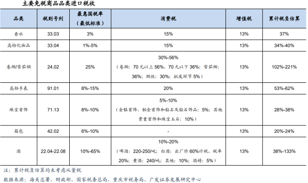 免税行业作为旅游行业的一个子行业,是指部分国家和地区授权一家或几家企业,允许其在运输工具、口岸或市内设立门店,向出入境旅客销售免税商品的旅游零售行业。目前,全球常见的免税店业态包括出入境免税店、离岛免税店及市内免税店(本质也是上述两者的延伸)。根据销售场所及供应对象的不同,免税店又可划分为机场免税店、机上免税店、边境免税店、外轮供应店、客运站免税店、火车站免税店、外交人员免税店、市内免税店、邮轮免税店等。免税行业包含免税购物(Duty Free)和退税购物(Tax Free)两种形式,其中免税购物是指免去商品进口环节的关税、消费税和增值税等,主要有化妆品、香水、箱包、首饰、手表、服装服饰、食品、玩具、烟、酒等,通常为进口商品,购买人群既有本国人员,也有境外人员;退税购物是指买完商品后再办理增值税、消费税退税手续,针对的商品主要为个人使用的消费品,适用对象一般为境外人员,一般而言退税的税收减免程度弱于免税购物,且流程更加复杂。其中免税购物中,免税商品免税额的具体计算公式如下:免税商品免除的税额=完税价格×关税税率 (完税价格 关税税额)/(1-消费税率)*消费税 (完税价格 关税税额)/(1-消费税率)*增值税率。“十四五”规划纲要提出,扩大节假日消费,完善节假日制度,全面落实带薪休假制度。培育建设国际消费中心城市,打造一批区域消费中心。完善市内免税店政策,规划建设一批中国特色市内免税店。中国旅游研究院(文化和旅游部数据中心)大数据监测显示,2024年除夕当日入境游客超60万人次,法国、德国、意大利、荷兰、西班牙、马来西亚、新加坡等新增免签入境中国的国家游客增长明显。春节假期的入境旅游客源国主要有缅甸、马来西亚、美国、英国、澳大利亚、韩国、泰国、新加坡、俄罗斯和菲律宾。受互免签证政策、支付便利化及国际航班增密等利好影响,入出境游市场热度持续高涨,入出境旅游约683万人次,其中出境游约360万人次,入境游约323万人次,均接近2019年同期水平。据中国旅游研究院数据,到2024年入出境旅游人次和国际旅游收入将分别超过2.64亿人次和1070亿美元,有利于我国出入境免税店业绩进一步提升。2024年春节假期海南离岛免税销售火爆,省商务厅2月18日提供的统计情况显示,春节假期(2月10日至17日),海南12家离岛免税店总销售额31.61亿元,日均销售额近4亿元,同比增长7.15%。其中,免税销售额25.64亿元,免税购物件数207.39万件。3、免税本质为国家财政税收让利,具有较强政策属性,行业进入门槛较高免税是旅游零售业态,其本质为国家财政税收让利,具有较强政策属性。免税零售运营商获取由国务院或其授权部门批准的经营资质后,在港口、交通工具以及城市内特定场所,向满足条件的旅客提供免税商品销售服务。目前免税店已经成为国人奢侈品消费的主要渠道之一。免税商品由于免征了进口环节税收,价格普遍低于专柜等其他零售渠道,具有明显价格优势。免税零售以进口高档商品为主,品类涵盖香化、烟酒、珠宝首饰、腕表、箱包等,此类商品在进口时需缴纳税率较高的进口关税、进口消费税及进口增值税,经粗略测算,进口香水、高档化妆品、烟、酒累计税负约为37%、34%-40%、102%-221%、53%-62%、38%-133%。我国免税店采取特许经营模式,免税商品经营资质为国家特许经营,具有政策壁垒和稀缺性,行业进入门槛较高。我国免税行业始于1979年原中国旅行游览事业管理总局(中国旅游局前身)向国务院上报开办免税品销售业务并获批。1983-1984年中国出国人员服务总公司(中出服)和中国免税品公司(中免集团前身)先后成立,是中国最早的两家免税品专营企业,此后行业进入快速发展阶段,逐步走向市场化。2000年四部委联合发布免税业基础性政策《关于进一步加强免税业务集中统一管理的有关规定》以及2006年海关总署发布《中华人民共和国海关对免税商店及免税品监管办法》,明确我国免税品业务经营采取垄断经营和统一管理,经营资格由国务院或其授权部门审批,从政策层面决定了我国免税行业垄断格局的形成。免税商品是旅游零售业的分支,指部分国家和地区授权企业在其运输工具、口岸或市内设立门店,供出入境旅客购买免税商品。2022年全球免税商品市场规模为1623亿元,预计到2026年,全球免税商品市场规模将达到7400亿元。据中国中免港股招股说明书预测,到2026年,中国免税总市场规模将达到3329亿元,其中,出入境免税店和离岛免税店是中国最大的免税渠道,将分别实现市场规模593亿元和2432亿元。02