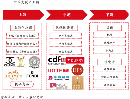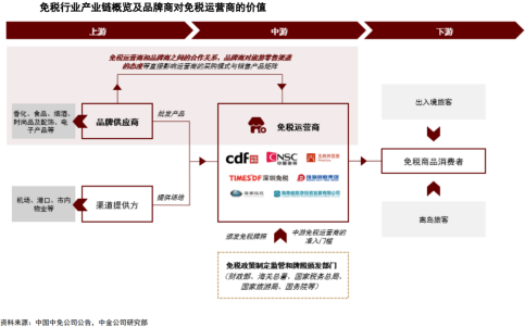 免税产业链涉及多个环节和参与者,从上游的供应商到下游的消费者,每个环节都对整个行业的运作至关重要。在免税产业链中,提供香化、烟酒、时尚精品等品牌供应商是上游行业,免税运营商与品牌商建立良好合作关系、增强渠道议价能力和货源获取能力,从而压低进货成本,赚取更高的毛利;出入境旅客和离岛旅客则处于行业下游,由于免税商品能免除关税、消费税以及增值税,相较于专柜价格较低,对下游消费者具有吸引力。
