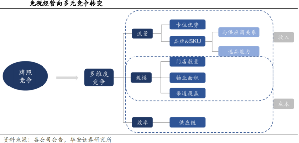 中免在全渠道份额领先,其他玩家差异化发展。在2024年中国免税及旅游零售市场中,中免集团全渠道覆盖以78.7%的市场份额稳居第一,其次是海发控、海旅免税、深免、珠免、中出服、其他。当前来看,重点渠道如机场免税正迎来合约到期租金重签;海南免税中免竞争优势持续扩大,其他玩家差异化发展;市内免税尚处于起步阶段,目前来看中免卡位核心机场预期有望承载主要政策红利。总体上我国免税全渠道预计仍将呈现一超多强格局。竞争者趋向多元,差异化运营构筑长期壁垒。近年来免税行业竞争者逐渐增多,现有运营商仅凭借牌照优势已难以在日趋激烈的竞争中保持优势,各免税商开始打磨自身运营能力,吸引更多消费者以及实现自身降本增效。以海南离岛免税为例,海旅投、海发控、深免、中出服等新运营商入局后,各免税运营商为吸引流量推出多样化营销活动,例如:聚焦品牌首店,抢占客户心智。2022年首店、独家品牌在海南离岛免税市场频频出现,2022年10月28日开业的海口国际免税城800多个国内外大牌中有25个为海南免税店首进品牌、78个为海南离岛免税中免集团独家品牌;深免海口观澜湖免税城也持续加码首店经济,截至2022年末已经集合了40个国家的5大品类的世界酒水集合馆,拥有全球前三大烈酒品牌及干邑高端品牌旗舰店集群。优化会员服务,升级购物体验。以中国中免为例,公司不断优化会员体系、丰富会员权益,目前中国中免会员总数已超过2200万,并于2022年开通“尊享会员”专属通道,进一步提升客户体验,持续深耕会员价值提升会员客单价和复购率。多样化营销活动迎合消费者。当前免税商营销活动持续创新,除了愈发丰富的线下主题营销外,还推出了直播带货、逛店种草直播、品牌合作直播等线上营销活动。对标韩免,强者恒强依旧是主旋律,运营能力是制胜关键。韩国于2000年、2013年、2016年先后进行三次大规模免税牌照开放,在行业规模实现快速扩张的同时,市场竞争也日益加剧。2013年起韩国开始向多个中小企业发放免税牌照,自此免税市场进入动荡和激烈竞争时期,其中百货巨头新世界获得市内免税牌照后凭借丰富的零售运营经验和渠道优势迅速扩张,最终竞争结果为龙头企业优势依旧,而运营水平较弱的小公司由于亏损自动退出市场,供给侧逐渐整合,行业仍保持较高的市场集中度,呈现出乐天、新罗、新世界三足鼎立的寡头垄断格局。参考韩国免税市场发展历程和经验教训,预计未来市内免税业态将成为免税行业新的发展方向,预计国内将有序允许新免税商进入,百货商超、旅游零售等行业的龙头企业或将有机会入局。短期来看行业可能出现竞争加剧,但从长期来看免税商的核心竞争力将由单纯依靠牌照壁垒过渡至规模优势和运营能力,良性竞争将推动行业加速发展,马太效应显现,最终形成较为稳定的市场格局。随着免税政策的放开,免税牌照增多且企业可以通过与免税经营商合作切入免税赛道,传统的牌照垄断优势被打破,免税经营向多维度竞争转变:流量:客流量主要取决于:区位:人流量较大的交通枢纽、旅游景区和繁荣的商业区往往能够带来更多的客流;品牌&SKU:与更多品牌商建立良好的关系,能够提高品牌丰富度,同时需要专业的选品团队搭配合理的品类组合,从而增强门店吸引力,提高消费者转化率和客单价。规模:免税经营商可以通过收购、自建等方式提高门店数量、扩大物业面积、提高渠道覆盖范围等方式形成规模优势,一方面有助于提升客流、提高顾客选择范围,从而增加消费者转化率,另一方面可以提高议价能力、形成规模效应,降低成本。效率:免税运营商可以通过数字化赋能,建立采购、销售、物流一体化供应链体系,实现降本增效。07