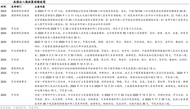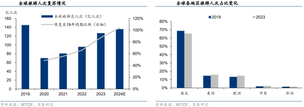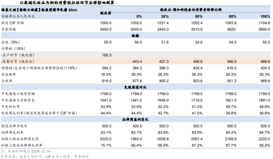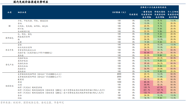 国际旅游稳步复苏,亚太地区潜力足。据WTCF发布的《世界旅游经济趋势报告(2024)》,全球旅游迎来全面复苏。2023年全球旅游总人次达到126.73亿/同比 41.6%,恢复至2019年的87.4%;预计2024年全球旅游人次达到135.79亿/同比 7.1%,恢复至2019年的103.9%。分地区看,2023年亚太地区旅游总人次为82.89亿人次,占全球比例65.4%。据国际机场协会,全球航空旅客运输量将于2024年恢复至2019年水平,并预计在2023年至2042年期间保持4.3%的复合年均增速,其中,亚太地区将成为未来的增长重心,预计2040年亚太地区的航空旅客运输量贡献度将达到全球的一半以上。出入境修复正当时,China Travel持续升温。自2H23起,文旅部、国家移民管理局、外交部等相关部门陆续颁布一系列出入境放宽政策。截至24年12月,72/144小时过境免签政策已经覆盖41个适用口岸、54个国家。国家移民管理局数据显示,3Q24入境外国人818.6万人次/同比 48.8%,其中通过免签入境488.5万人次,占比60%,同比增长78.6%。海外社媒平台上“China Travel”成为热点话题,或将持续升温国际旅客入境游热潮。免税成长空间广阔,打造渠道价值为核心。据Global Blue发布的2024年10月全球免税购物情况,全球市场/亚洲地区3Q24免税销售额较2019年同比复苏145%/186%。随着全球出行复苏,中国出入境客流稳步增长,亚太地区有望进一步释放消费活力。据科尔尼,22年中国旅游零售市场规模(销售收入口径)达到约1000亿人民币,免税市场占旅游零售市场比例从19年的55.1%上升至59.5%。据科尔尼预测,我国旅游零售市场将于2022-2026年以超40%的复合增速持续发展,其中免税市场的年复合增长率为54%。2、免税行业规模成长空间广阔,免税性价比优势持续凸显免税市场的持续增长有赖于产品结构的优化调整、渠道品牌的迭代升级。据中免港股招股说明书,中免精品销售占比不断攀升,从2019年的12.3%升至1Q22的31.3%。据毕马威,2025年海南免税品销售中香化类占比将会从2019年的65%下降至50%,高端精品类则从19年的15%增长至40%。免税品类结构进一步升级,彰显免税作为高端消费渠道之一,其价值和重要性或有提升。据要客研究院发布的《中国奢侈品报告2023》,2023年全球奢侈品市场规模为2.72万亿人民币/同比 7%,其中中国人奢侈品消费额达1.04万亿人民币/同比 9%,占全球比重为38%。头部奢侈品品牌入局寻找增量空间,中国免税市场具备增长性。国内外价差以及奢侈品品牌、数量、种类等供需错配是奢侈品消费外流的主要原因之一。随海南自贸港区位价值不断提升,部分奢侈品牌逐渐转移市场重点,LV、香奈儿等陆续宣布从韩国免税渠道撤柜,并陆续在海南展开布局,其中三亚海棠湾免税城已汇集了LV、Celine、Dior、Prada等奢侈品大牌。免税渠道与高奢品牌相互合作持续优化消费体验,为国内免税市场打开增量空间。对比其他渠道,跨境电商渠道优势胜在方便快捷,虽然可售品类大于免税零售的范围(据2019版《跨境电商进口商品目录》,跨境电商可经营品类为1413类),但仍然以大众化品牌为主,在香化品、手表、首饰、箱包等方面来看从知名奢侈品品牌丰富度等角度而言,与免税渠道仍有差距。进口商品从进口环节到终端消费者手里,主要有四种渠道:免税、一般贸易、跨境电商、个人邮寄。对比四种零售渠道,免税运营商可免除3税(关税、增值税、消费税vs跨境电商只是免关税,增值税和消费税收70%),价格上天然仍具备一定优势。此外,免税运营商向品牌直采,降低流通环节成本,正品更具保障。在不考虑购物限额的情况下,计算了四种渠道下商品的进口成本。分品类看,高级香化在一般贸易、跨境电商和个人直邮下的进口成本比免税高出30%-40%,20%-30%,40%-50%,3C、箱包则为10%-20%左右,烟酒则在50%以上。据科尔尼,以高端香化商品终端售价为例,海南免税标价比官方标价低20-40%,比跨境电商(天猫国际)低10%-20%。对比各国免税渠道价差,国内免税渠道价格优势显著。在比价小程序“杰西卡的秘密”的各品类人气榜前十的单品中,香化品类中有5款单品在国内免税渠道为最低价,食品酒饮中有7款单品在国内免税渠道为最低价,电子产品中有8款单品在国内免税渠道为最低价。箱包配饰品类中的高奢商品多以品牌自营店形式出售,部分已进入免税渠道的品牌如卡地亚、Omega等在国内免税渠道价格优势亦较为突出。考虑到境外购物仍需要考虑交通住宿等成本,海外代购则需要支付更高信任成本,国内免税渠道具备性价比优势。消费税改革有望提振需求,放大免税价格性价比。通过梳理过去十年相关政策文件和“十四五”规划,预计消费税改革政策落地,适度扩大征税范围和征税环节后移或成为三大重点改革方向:适度扩大征税范围,更多高档、奢侈消费品或纳入征收范围,且消费税改革可能在奢侈品、高档服务上先试点;税收征收环节后移,消费税从对生产端征税转向从消费端征税;稳步下划地方,实现消费税央地共享,从总量层面对地方税收实现补充,促进地区间税收收入分配公平,健全地方税体系。我国的消费税仅包含了特定商品,未列入服务类税目。海外国家针对高档服务征收消费税已经拥有较多的实践经验。免税商品主要以高端商品为主,若未来率先对奢侈品和高档服务进行试点改革,将更多高端、高价商品纳入消费税征税范围,叠加消费税征收环节后移,终端有税零售渠道和免税渠道价差或有所扩大,免税渠道的
