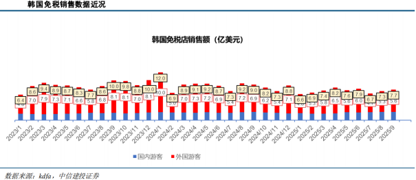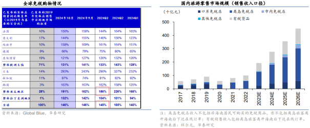 2025年9月起,海南离岛免税销售边际改善。2025年,海南离岛免税销售呈现触底反弹态势,自9月起,海南离岛免税销售额同比增长3%(18个月以来首次增速转正),10月同比增速进一步扩大至13%,其中购物人数同比-13%、客单价同比 30%。11月1日起,离岛免税新政实施后,11月海南离岛免税销售呈现高双位数增长,剔除手机、黄金首饰等优势品类,大盘增速表现仍亮眼。展望2026年,中高端消费呈现复苏趋势,离岛免税新政中关于岛民免税、离境旅客免税等政策效用仍待释放,海南离岛免税销售数据有望逐月改善。2、出入境客流恢复叠加政策优化,口岸及市内免税持续受益出入境客流持续恢复,口岸及市内免税店受益。根据航班管家数据,截至2025年12月初,国际航班执行量已恢复至2019年同期水平的88%。国家移民管理局官方数据显示,2025年前三季度全国累计查验出入境人员5.1亿人次,同比增长14.9%,其中内地居民出境2.48亿人次/较19年恢复度71%,港澳台居民往来2.05亿人次/较19年恢复度91%,外国人入境0.57亿人次/较19年恢复度93%。口岸及市内免税政策优化。2025年10月30日,财政部等部五部门发布完善免税店支持政策,支持口岸及市内免税店进行国内商品退免税政策,扩大免税店经营品类,鼓励手机、无人机、运动品等产品进入免税店,且进一步优化市内免税的提货模式,对于市内免税店所在城市有口岸进境免税店的,旅客在市内免税店预订后,进境时在口岸进境免税店付款提货,此举有助于优化国人在市内免税店购物举措,增强购物意愿。3、韩国免税持续承压,全球高端消费品牌回暖,海南在亚洲渠道中较领先韩国外国游客销售额:9月销售额达到5.61亿美元,同比-18.8%(上月为-27.3%):其中购物人次 19.2%,客单价-31.9%达到554.15美元;年初至今累计销售额49.50亿美元,同比-21.3%:其中购物人次 17.5%,客单价-33.0%;整体市场:9月销售额达到7.67亿美元,同比-14.3%(上月为-20.5%):其中购物人次同比 4.6%,客单价同比-18.1%达到292.74美元;年初至今累计销售额66.33亿美元,同比-17.3%,对应约471亿元人民币。韩免9月外国游客和整体市场销售额同比降幅较8月环比有所收窄,但降幅仍明显高于6~7月,而中国市场海南离岛暑期销售额、国庆中秋销售额均表现稳定或提升,相较韩免情况明显更积极。结构端,9月韩免外国人购物人次增幅均环比略升,而本地购物人次降幅环比扩大。客单同比也出现外国人降幅环比收窄,但本地客单增速连续两月下降,韩国国内市场趋势承压,海外yoy降幅仍较大。9月整体客单恢复度约81.9%,较8月 6.2pct;新罗免税9月中旬返还仁川机场销售化妆品和香水区域经营权,并已向机场缴纳约合人民币9.7亿元违约金,因销售额与客流并不匹配;韩国渠道也有所变革,在核心商圈积极打造优质体验和支付便利的欧利芙洋(OliveYoung)等美妆集合店创历史佳绩;LV等高端消费展现回暖迹象,但当前对比中日韩渠道yoy变化,中国渠道或受益更多。随着出入境客流的恢复及免税政策的持续完善,中国免税市场有望重回增长轨道,免税市场将从离岛免税“一家独大”的格局逐步转向“离岛 市内 口岸”协同发展的格局。离岛免税之外的第二增长曲线—市内免税店:2024年10月市内免税店政策正式完善,现有的13家外汇商品免税店转为市内免税店,并在广州、成都、深圳、天津、武汉、西安、长沙、福州8个城市新设市内免税店,全国市内免税店体系扩容至27家。市内免税店允许旅客在离境前60天内购买,且不设购物限额,使得消费者购物意愿显著增强。海南自贸港封关红利:2025年12月18日海南自贸港将正式启动全岛封关运作,封关后海南免税进口商品的种类将大幅扩容,本地消费潜力也将得到释放。此外,三亚国际免税城三期预计于2026年底开业,主要聚焦重奢品牌和高税率商品,进一步提升海南的消费吸引力,有望提高奢侈品消费回流比例。入境游爆发带动免税消费:随着中国免签范围的扩大和“China Travel”在全球的影响力持续飙升,入境消费也成为免税市场新的增长机遇。入境游客在海南和市内免税店的消费占比正在提升,且其客单价往往高于国内游客,是高质量的增量客流。“国潮”出海:政策鼓励市内免税店销售具有中国特色的“国潮”产品,如国产美妆、电子产品(无人机、手机)、丝绸、茶酒等,使免税渠道成为国货出海的重要展示窗口,满足入境游客对中国商品的购买需求。03