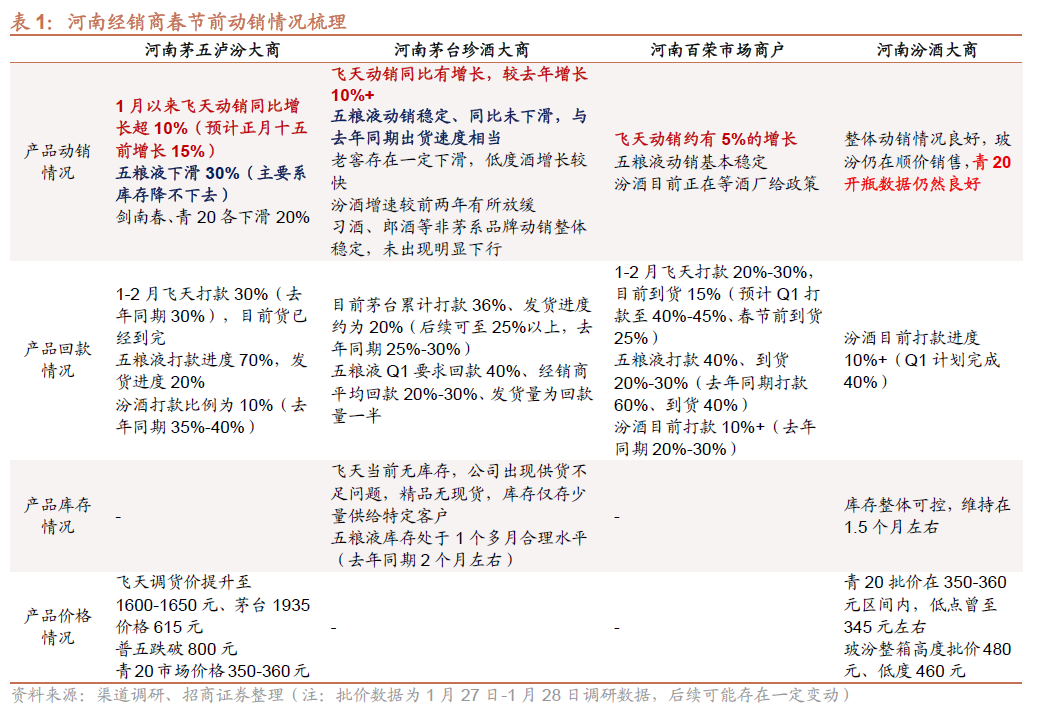 1)分产品看,茅台量、价皆超预期,传统渠道按月发货,渠道基本无库存,动销双位数增长,终端备货积极性提升,i茅台渠道打开增量消费需求,预计1月净增量2000吨以上。五粮液各地动销分化,预计销量同比基本持平微增,四川、安徽等地流速加快。老窖高度国窖多地区动销出现20%以上下滑,低度仍有一定需求。汾酒动销青20略降、玻汾有增长,渠道利润有所收窄。地产酒今世缘双位数下滑好于行业,洋河动销下滑15-20%、迎驾洞藏动销下滑大个位数、古井大个位数到双位数下滑,古20承压,古8、16稳健。