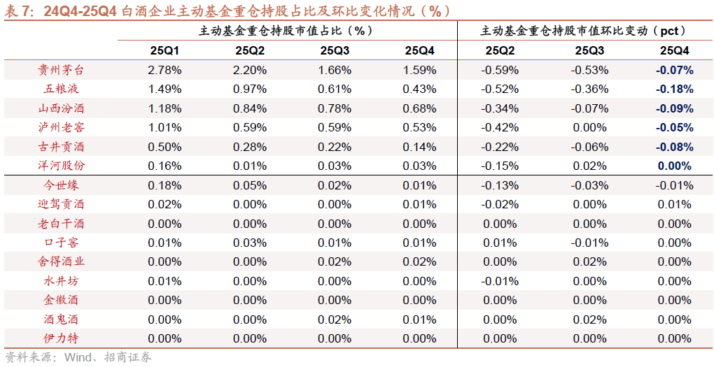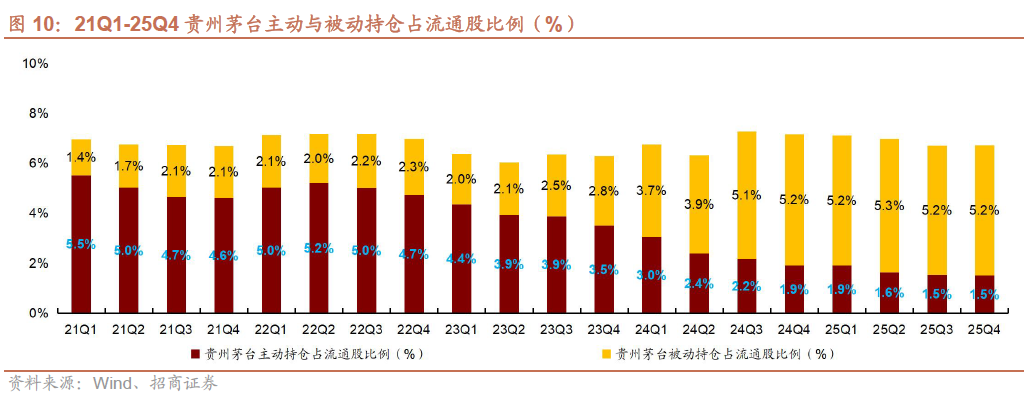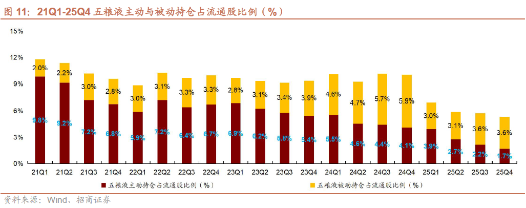 茅台主动/被动基金持仓占流通股比例持平、五粮液主动持仓下降、老窖被动持仓略有下降。25Q4贵州茅台/五粮液/泸州老窖主动基金持仓占流通股比例分别为1.5%/1.7%/5.1%,环比持平/-0.5pct/持平,被动基金持仓占流通股比例分别为5.2%/3.6%/6.8%,环比持平/持平/-0.1pct。