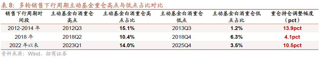 调整位置方面:1)综合对比前两轮销售下行周期白酒主动基金重仓情况,我们发现至25Q4,本轮白酒重仓占比已从高点回落10.5pct,调整幅度超过2018年,同时以超配比例统计,25Q4白酒板块超配比例仅为1.0%(相较于25Q3的1.2%继续下降),已低于13Q1-Q2水平,逐步接近13Q3-Q4水位。2)若剔除重点白酒赛道基金经理持仓,25Q3六大白酒重仓比例仅为1.8%,同样已至历史低位(接近13年水位)。