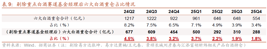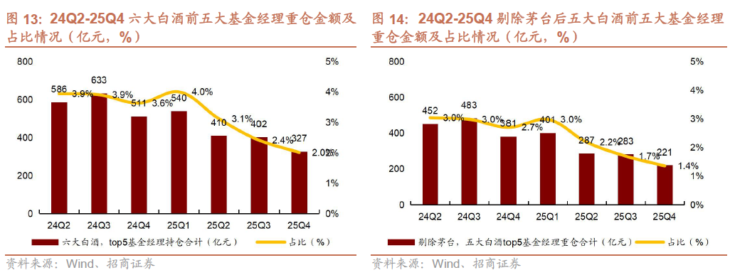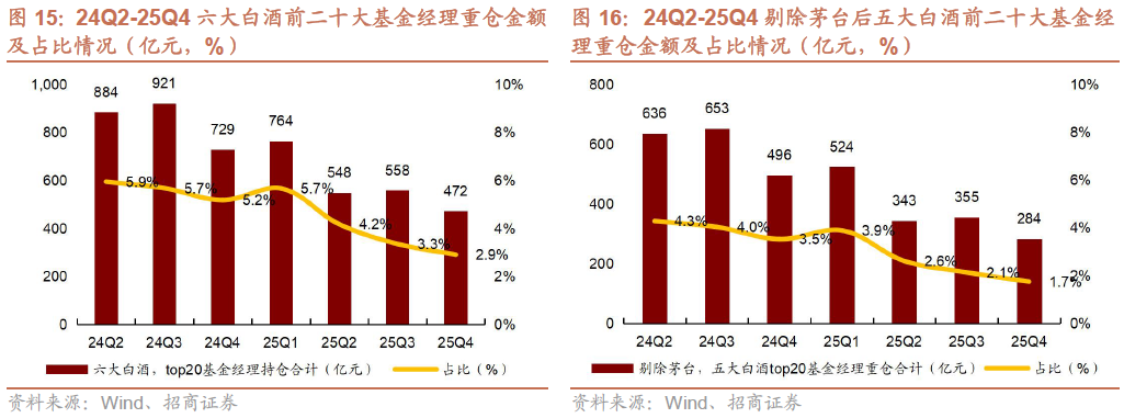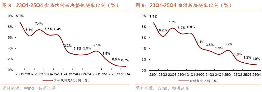 1)25Q4重点赛道基金经理筹码继续快速出清,其他筹码下降速度逐步放缓。25Q4重点赛道基金经理六大白酒重仓比例为1.6%(环比下降0.4pct,25Q2、Q3皆环比下降0.7pct),延续快速出清态势,而剩余六大白酒筹码重仓比例为1.8%(环比下降0.1pct,25Q2/Q3分别环比下降1.5pct与0.3pct),除重点赛道基金经理外,广大白酒持仓逐步趋稳。