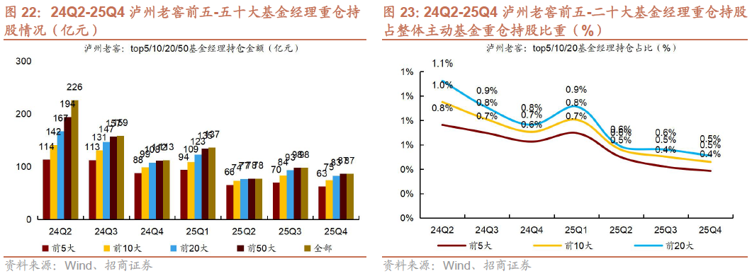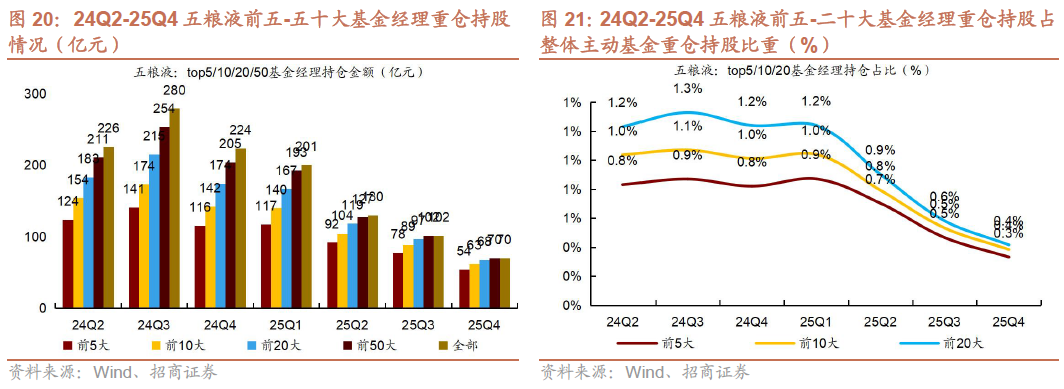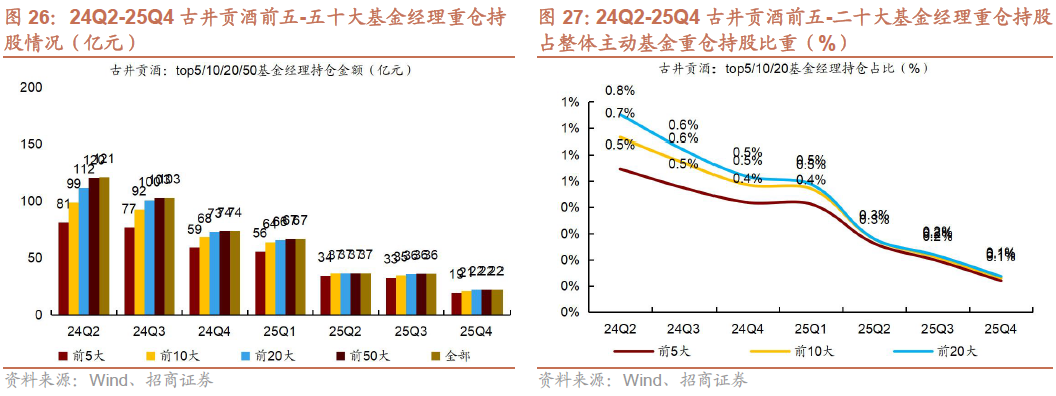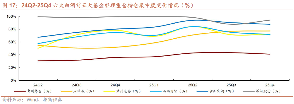 2)25Q4茅台、汾酒、古井持仓集中度下降。25Q4贵州茅台/五粮液/泸州老窖/山西汾酒/古井贡酒/洋河股份前五大基金经理重仓持仓占个股总重仓持仓比例同比-2.3pct/ 0.6pct/ 0.9pct/-3.4pct/-2.6pct/ 6.5pct,茅台、汾酒、古井持仓集中度下降。