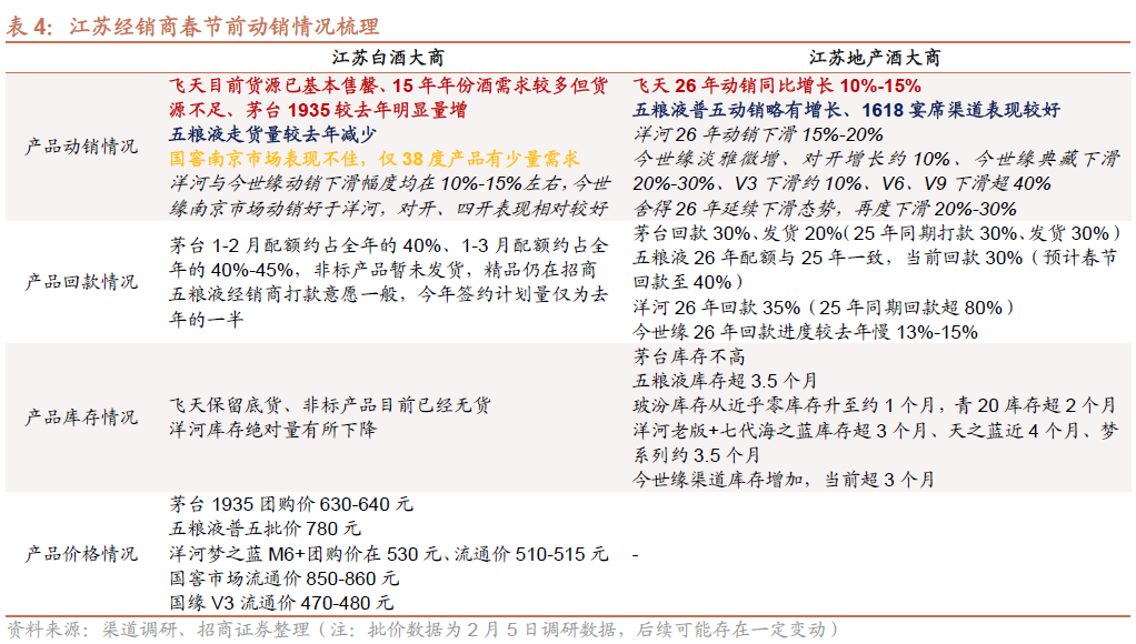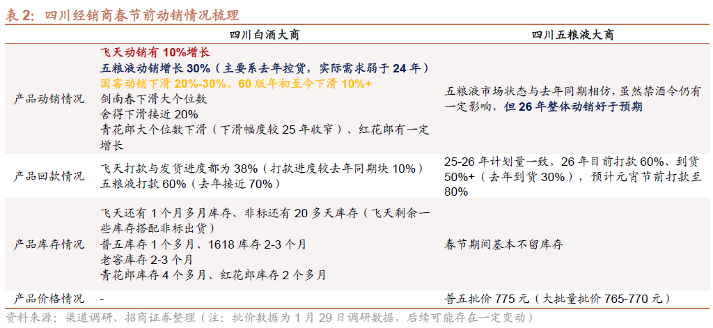 四川地区飞天动销双位数增长,五粮液由于25年春节控货因素而流速明显加快、26年动销好于预期,飞天保留少量库存、五粮液库存良性、经销商多选择旺季出货。国窖动销双位数下滑,其他品牌出现不同程度的下滑。