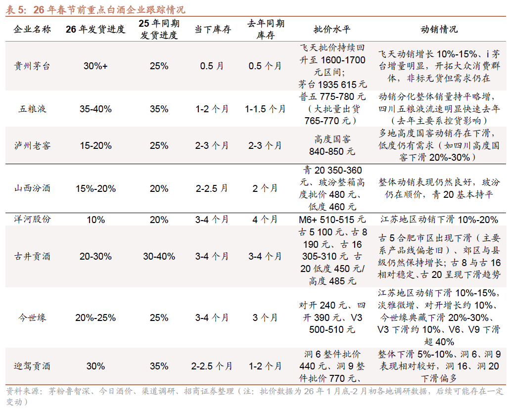 迎驾贡酒:渠道调研反馈,26年春节前打款35%(较去年同期慢5%)、发货30% (较去年慢5%),企业相对审慎不过多压货,酒厂要求3月底完成50%打款,预计春节期间整体动销下滑5%-10%,洞6、洞9表现相对较好,自点率持续提升。洞16、洞20下滑偏多,整体库存同比提升。
