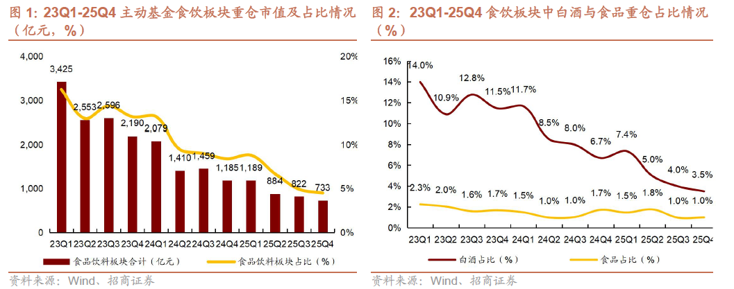 1)行业整体来看:25Q4主动基金食品饮料行业重仓持股市值总额为733亿元(yoy-38.2%、qoq-10.9%),重仓占比为4.5%(yoy-3.9pct、qoq-0.4pct)。
