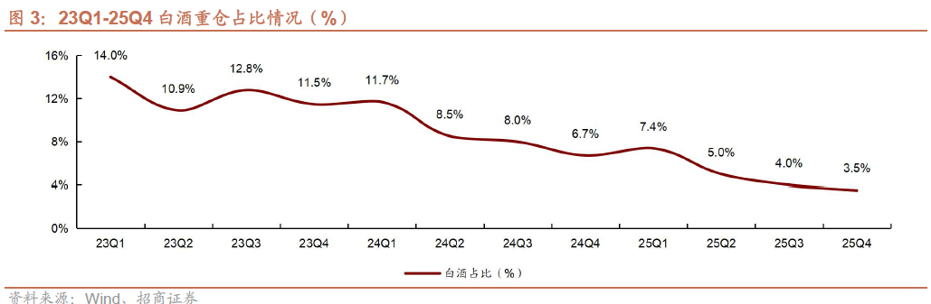 2、白酒板块整体持仓情况:25Q4持仓继续回落,头部白酒筹码加速释放