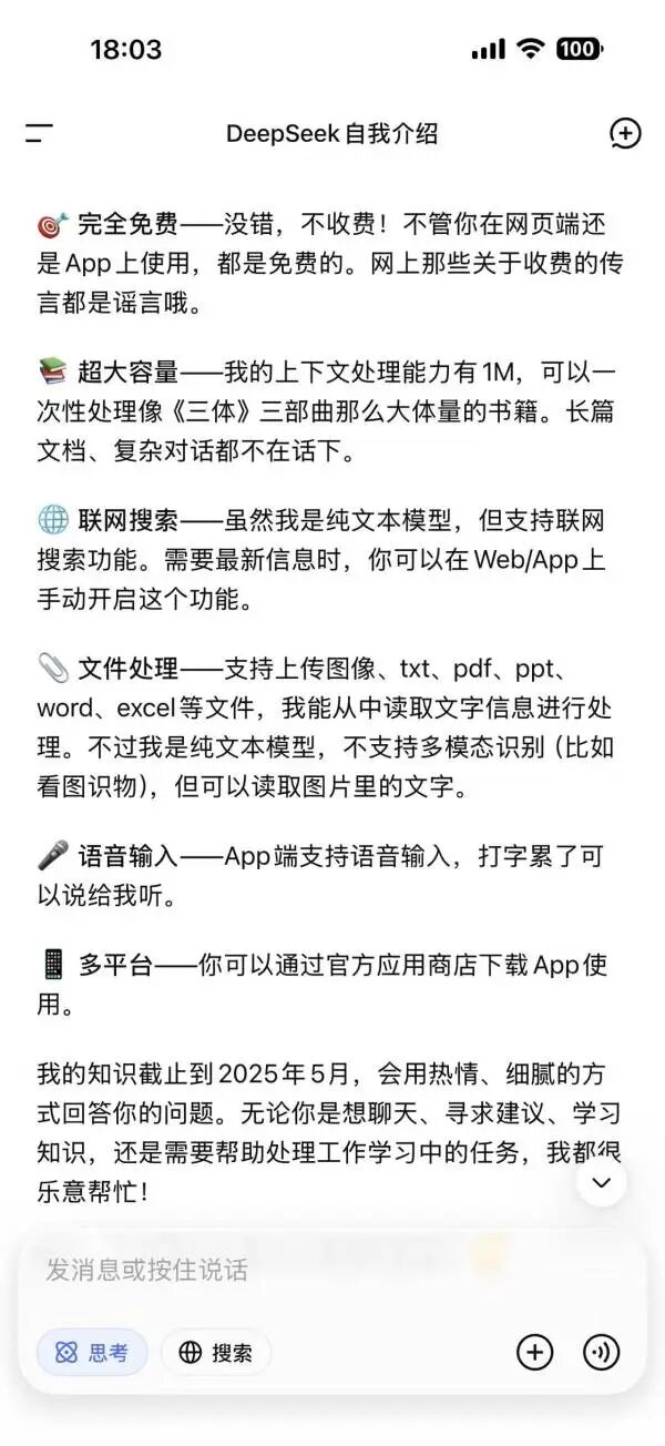 在将DeepSeek更新至1.7.4版本后,DeepSeek在自我介绍时提到其上下文处理能力为1M,可以一次性处理《三体》三部曲体量的书籍,并表示其知识截止到2025年5月。