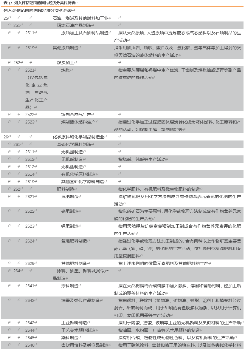 评估范围。包括《国民经济行业分类》(GB/T 4754-2017)中 25 大类的 251,252中2521(仅包括焦化企业焦油、焦炉气生产化工产品)、2522、2523;26大类的261,262中2621、2622、2623、2624、2629,264中2641、2642、2643、2644、2645、2646,265,266中2661、2662、2663、2664、2665、2666、2669,268中2684(仅包括合成香精香料)中相关企业。