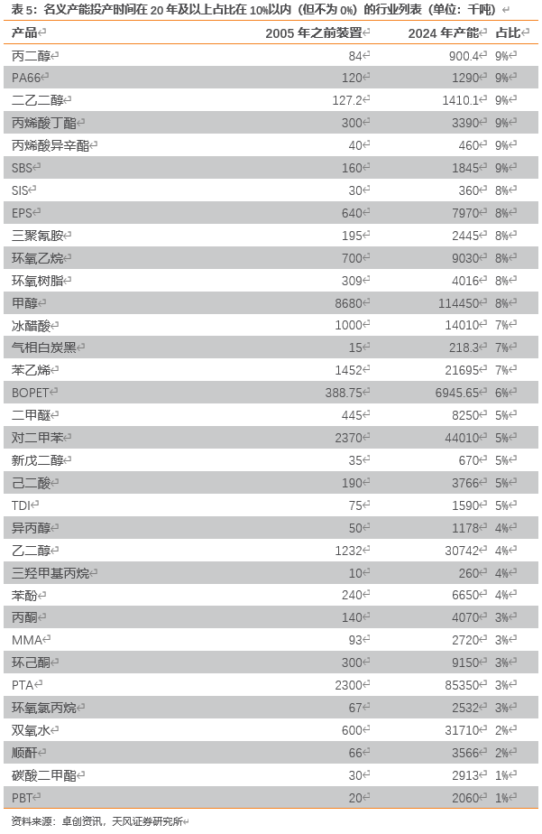 我们根据卓创资讯数据,针对149个化工子行业现有产能装置投放时间进行统计,形成5张统计表格。(但在国内,许多老旧装置历经多次改造,很多设备、管线在装置改造过程中已经更换,实际使用时间可能远低于装置运行时间。)