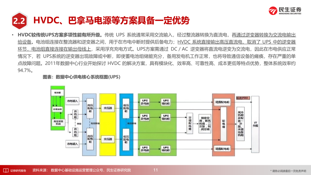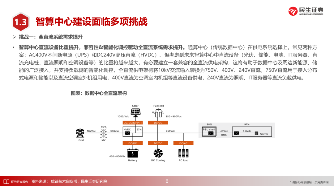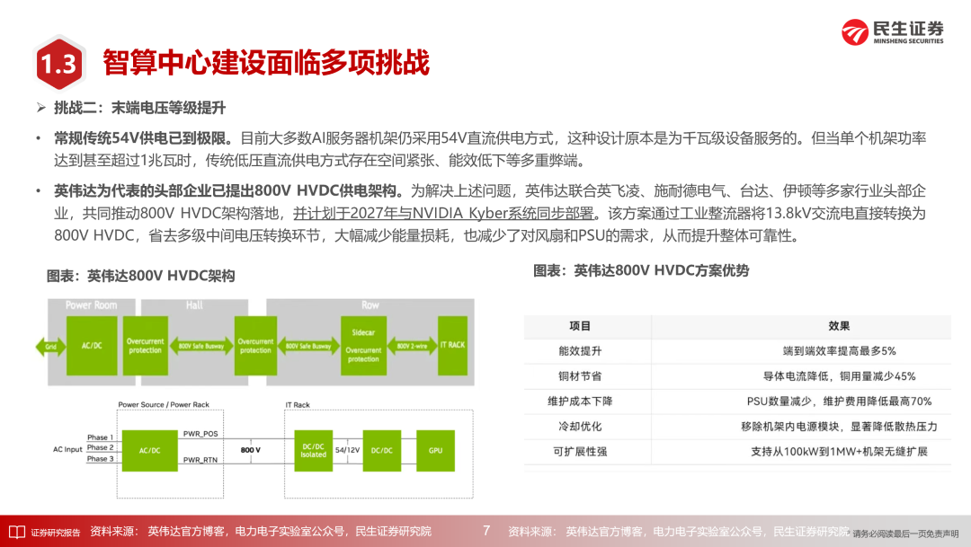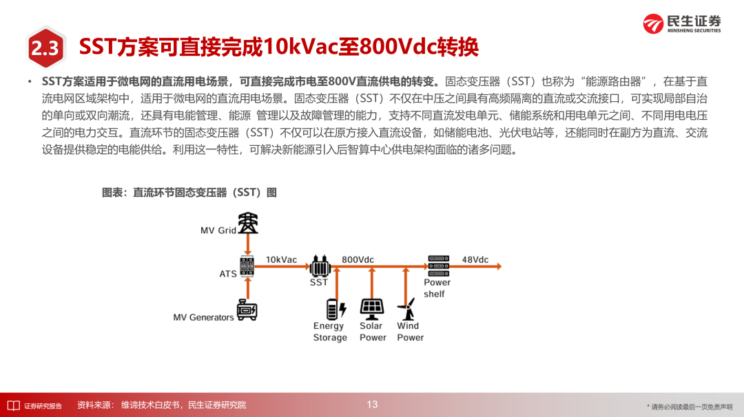 机架功率朝高密度方向演进使得数据中心供配电架构面临全直流系统需求提升、末端电压等级提升、供配电占地面积增加等较多挑战。HVDC方案较传统的UPS方案有一定升级,巴拿马电源方案进一步升级,可实现模块化及高效率。SST方案适用于微电网的直流用电场景,可直接完成市电至800V直流供电的转变,兼具体积轻便、可自主解决谐波治理等问题、可快速检测并隔离输入侧或输出侧故障、可支持双向功率流等优势,已在数据中心项目中得以应用。