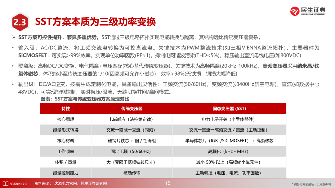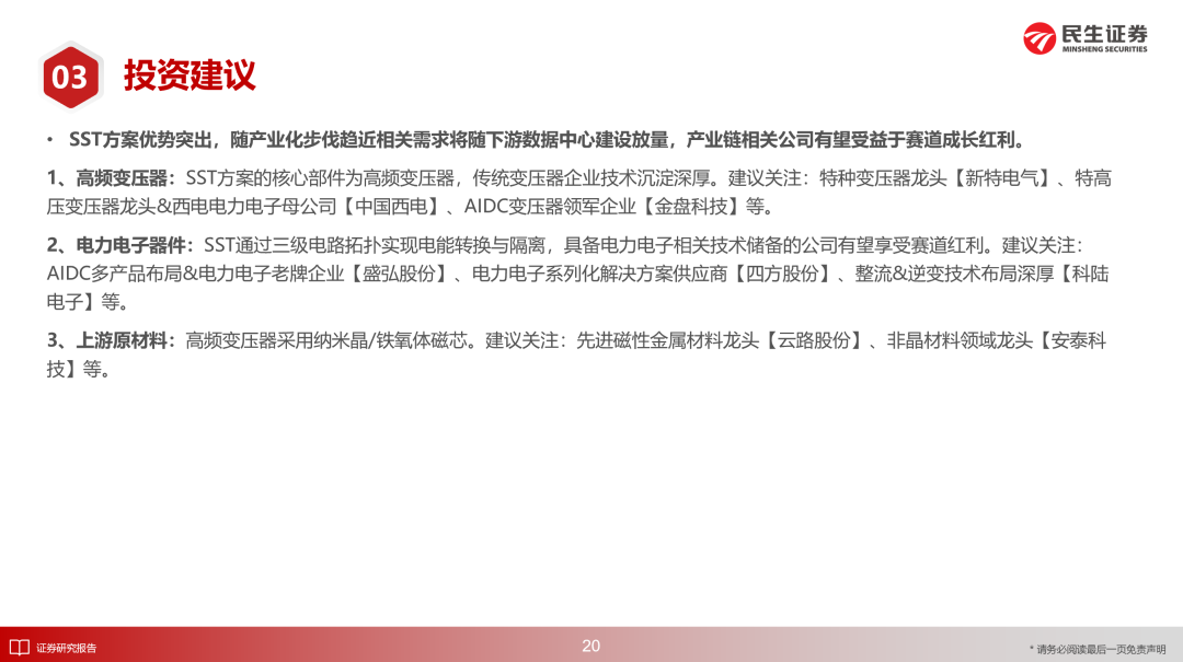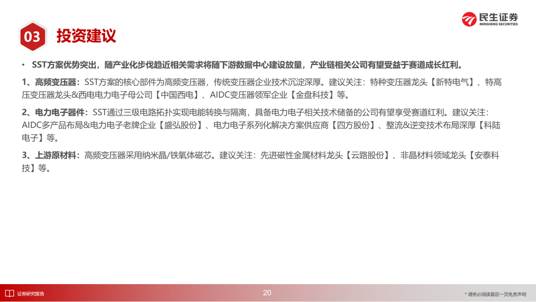 1、高频变压器:SST方案的核心部件为高频变压器,传统变压器企业技术沉淀深厚。建议关注:特种变压器龙头【新特电气】、特高压变压器龙头&西电电力电子母公司【中国西电】、AIDC变压器领军企业【金盘科技】等。