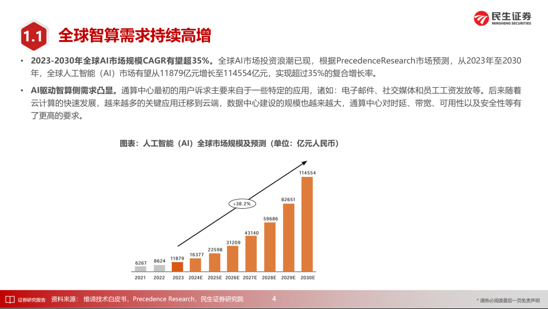 ■ 2023-2030年全球AI市场规模CAGR有望超35%,AI驱动智算侧需求凸显。