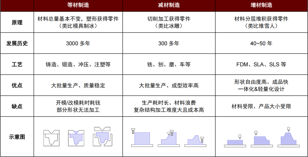 增材制造(也称3D打印)是基于3D模型,并通过材料分层堆积方式制造产品的生产模式。常见工作流程包括3D建模、模型切片、增材制造、去除支撑、后期处理。3D打印已有40多年发展历史,其优点在于成品速度快、可实现一体化和轻量化设计、产品形状自由度高,在小批量生产场景成本优势明显,缺点在于材料及产品尺寸受限。