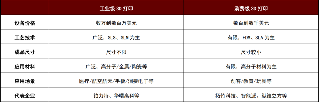 图表2:工业级3D打印与消费级3D打印对比