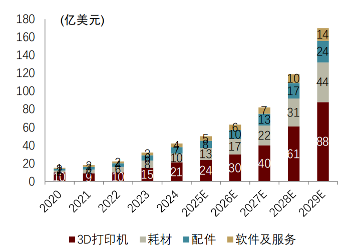 从销售额看,据灼识咨询数据,2020~2024年全球消费级3D打印机GMV由10亿美元增长至21亿美元,CAGR为20.4%;预计2029年将达88亿美元,2024~2029年CAGR为33.2%。