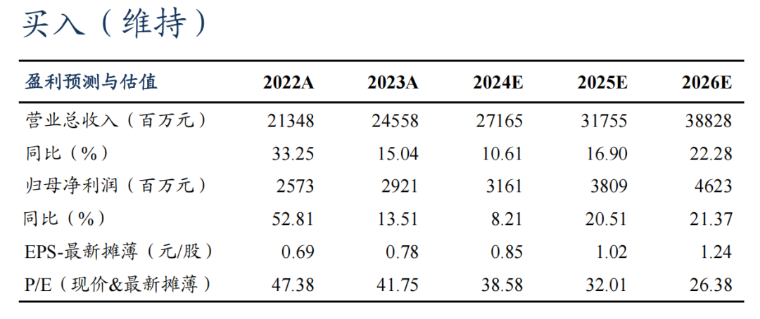 我们预计公司2024-2026年营收分别为271.7/317.6/388.3亿元,同比增长11%/17%/22%,2024-2026年归母净利润分别为31.6/38.1/46.2亿元,分业务来看: