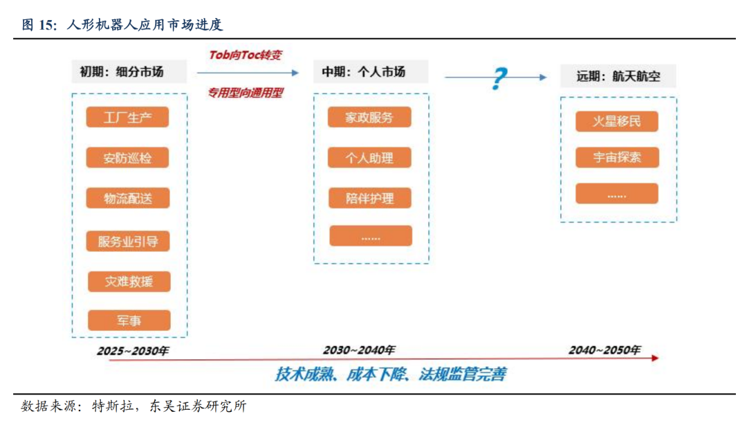 一个好的机器人可以不是最终“完美的” 机器人:参照自动驾驶,从L1-L3是经历5年以上迭代的,并且完全自动驾驶L5也仍需时间。我们认为人形机器人的成熟也是渐进式,可在细分市场率先商业化,如工厂生产、安防巡检、物流配送、服务业引导、救援、军事等,初期功能单一,后逐步成熟转为通用型机器人,由toB转为toC,进入家政等市场。
