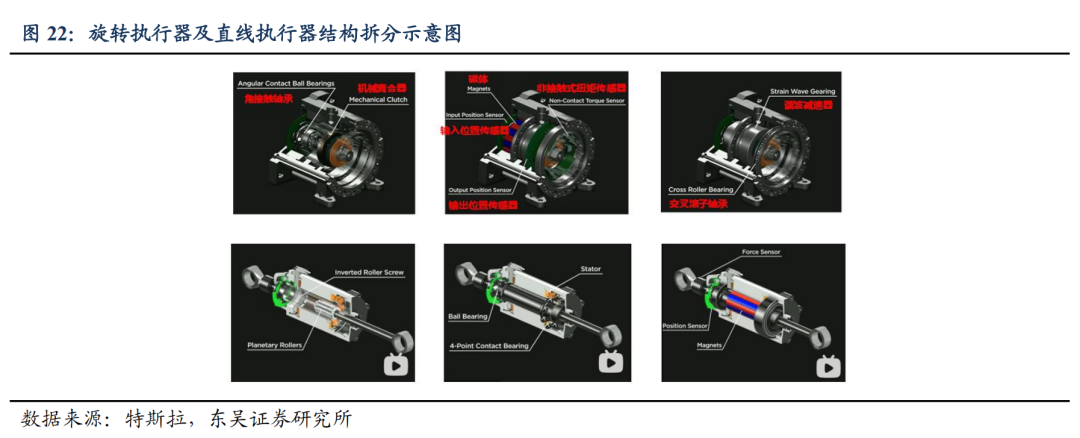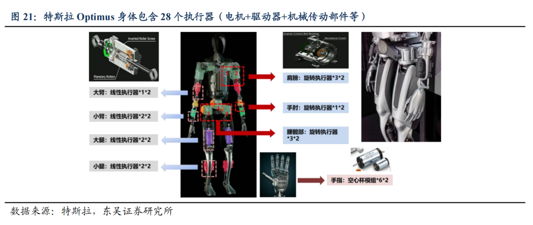 身体执行器初步定型,为最核心部件,三花紧密配合,技术性能基本达标,后续方案微调仍将保持主供地位,关注大规模量产降本:目前量来看,Optimus机电执行器系统含3大类、40个执行器—身体14个旋转执行器、14个线性执行器,手部12个空心杯模组(技术方案未定型),上述执行器均由“电机 传动装置 各类轴承 传感器”组成。关节方案设计和性能直接影响运动范围、精确度和可靠性。