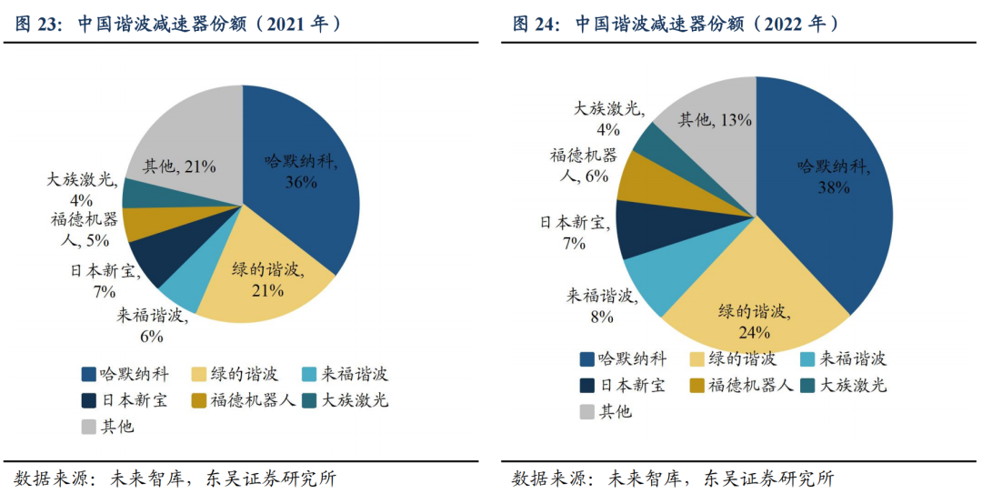 国内谐波减速器份额逐步提升。谐波减速器由柔轮、钢轮及波发生器组成,关键指标为减速比、平均负载转矩最大值、寿命、精度、强度等。哈默纳科此前全球份额超80%,但国内绿的、来福份额逐步突破,23年日本哈默纳科和新宝在国内份额已下降至45%。我们预计特斯拉初期主要用哈默纳科产品,但同步测试绿的谐波的产品,且绿的谐波与三花智控合资公司、价格具备优势,后续有望逐步切换。