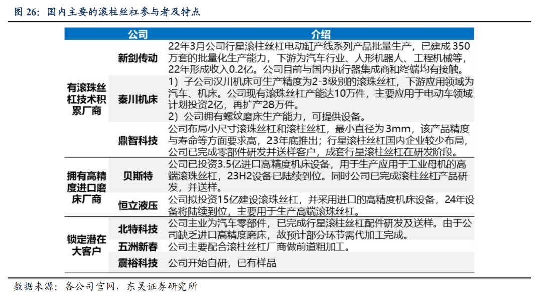 工艺及设备共同形成滚柱丝杠壁垒。滚柱丝杠难点在于精度的控制,特别是周围的6-12根小滚柱的精度要达到c2级别,否则位置互换时造成噪音和卡顿。从工艺角度看,热处理(影响寿命)、精磨(影响精度)、装配(影响一致性)是核心;其次,对设备的精度要求极高,特别是精磨设备,高精度设备主要来自日本三井和德国霍夫曼,设备交货周期1-2年。