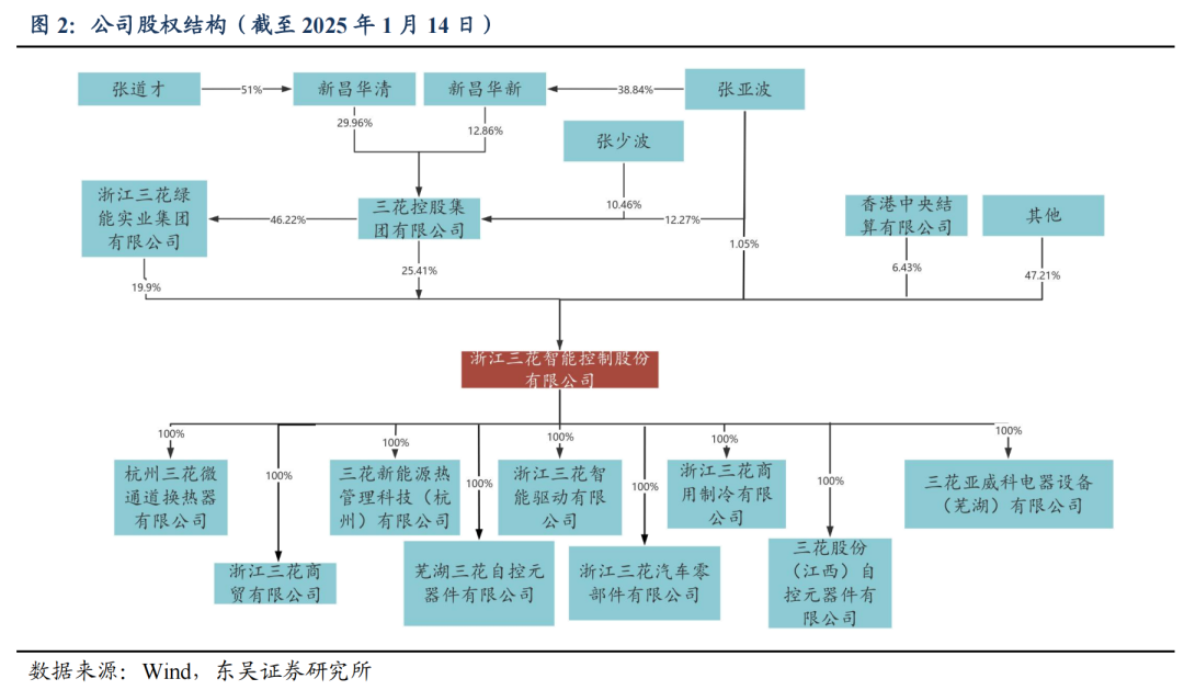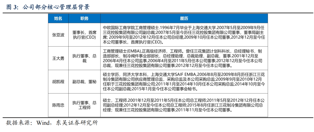 公司股权结构稳定,实控人为张氏家族。公司的实际控制人为张道才、张亚波和张少波父子三人,三人直接或者间接持有公司股份超过 50%。张道才自 1984 年起历任新昌县制冷配件厂、浙江省新昌制冷配件总厂厂长,浙江三花集团公司党委书记、董事长兼总经理,浙江三花集团有限公司党委书记、董事长兼总裁等。董事长张亚波系公司创始人张道才长子,公司董事张少波系张道才次子。公司股权相对集中,更有利企业对重大事项的决策。