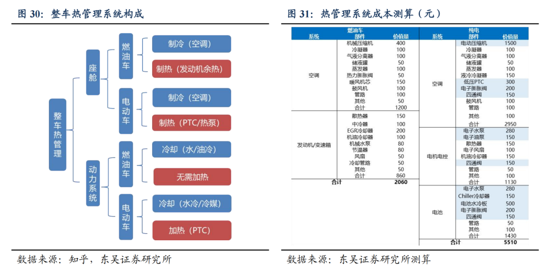 电动车热管理系统新增多种电子零部件,单车价值量高3k元 。燃油车热管理以机械零部件为主,包括蒸发器、压缩机、冷凝器、散热器、油泵、膨胀水箱、冷却液管路、气缸体、油冷器、恒温器等。而电动车动力系统热管理,新增加换热器、多向水阀、电子膨胀阀、PTC等;驾驶舱热管理增加电子膨胀阀、截止阀、四通换向阀等,以便控制制冷剂流量和流向。