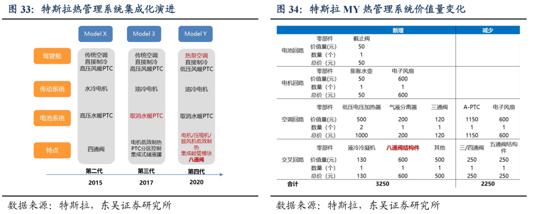 集成化有利于整车统筹能量管理,效率最大化。集成化的热管理系统利用多通道阀门或管路,将电池、电机电控和空调系统回路打通,形成一个大循环回路,统筹能量管理。以Tesla Model Y为例,设计出八通阀(类似四通阀集成),实现电池、电机、空调三大回路的串联和并联,我们预计单车价值量较Model 3高1k 元。