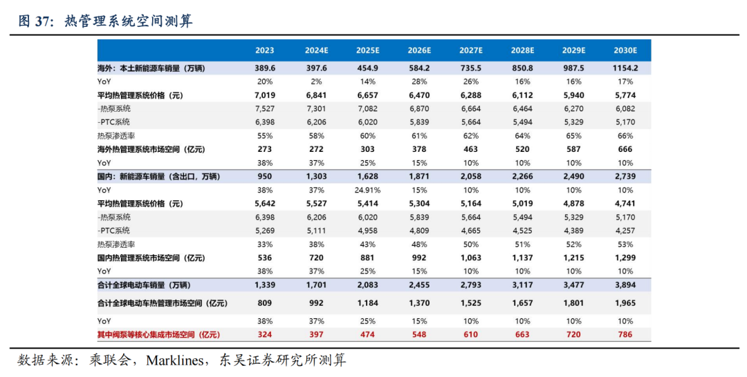 24年全球电动车热泵集成空间约400亿,2030年翻番。我们测算24年全球电动车热管理系统空间超950亿,其中泵阀等核心零部件集成空间约400亿(三花主要做的产品),25年行业需求增长25%,预计阀泵等核心集成市场空间470 亿元,2030年空间达到780 亿元。
