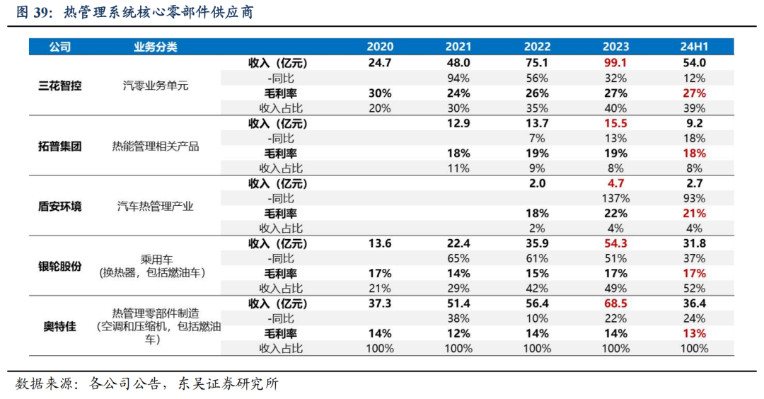 三花电子膨胀阀具备领先优势:深耕20年,2002年批量生产空调电子膨胀阀,2009年开始研发车用电子膨胀阀,2014年开始量产,首创车用电子膨胀阀,全球份额超50%。