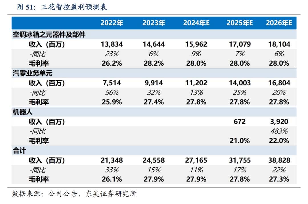 汽车增速25年恢复20%左右增长,家电业务稳定5-10%增长,贡献稳定现金流。 1)汽车方面,公司热管理系统核心模块全品类布局,电子膨胀阀市占率50% 、集成市占率60% ,24年由于第一大客户特斯拉销量持平、且欧美电动车销量低迷,公司汽零业务增速降至10-15%,预计收入/利润110-115/15-16亿元,展望25年特斯拉销量恢复20%增长,叠加欧洲25H2新车型放量,且国内新势力华为、小米、理想等销量强劲,汽零板块营收增速恢复至20%左右。 2)家电方面,公司空调制冷阀类、微通道、Omega泵等各品类份额基本全球第一,24年受益于家电国补、以旧换新等带动全年营收实现同增5-10%,预计贡献利润约15亿元,25年营收增速维持5-10%。综合看,24年传统主业利润有望达31-32亿元,25年维持15-20%增长至36-38亿元,未来保持稳健增长。