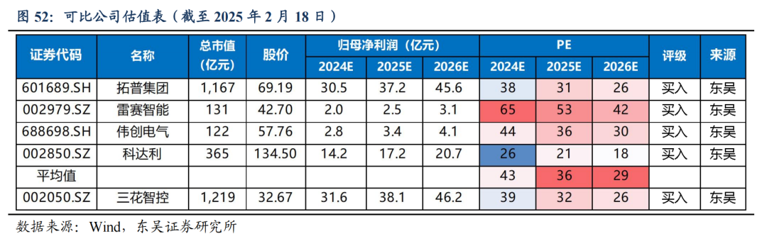 三花优势在于客户关系、软硬件技术、精密加工能力:执行器的构成包括硬件和软件相关的编码器、控制器,需要控制精度高,精密加工,和集成化能力,而三花电子膨胀阀全球份额超50%,充分验证其软硬件能力。