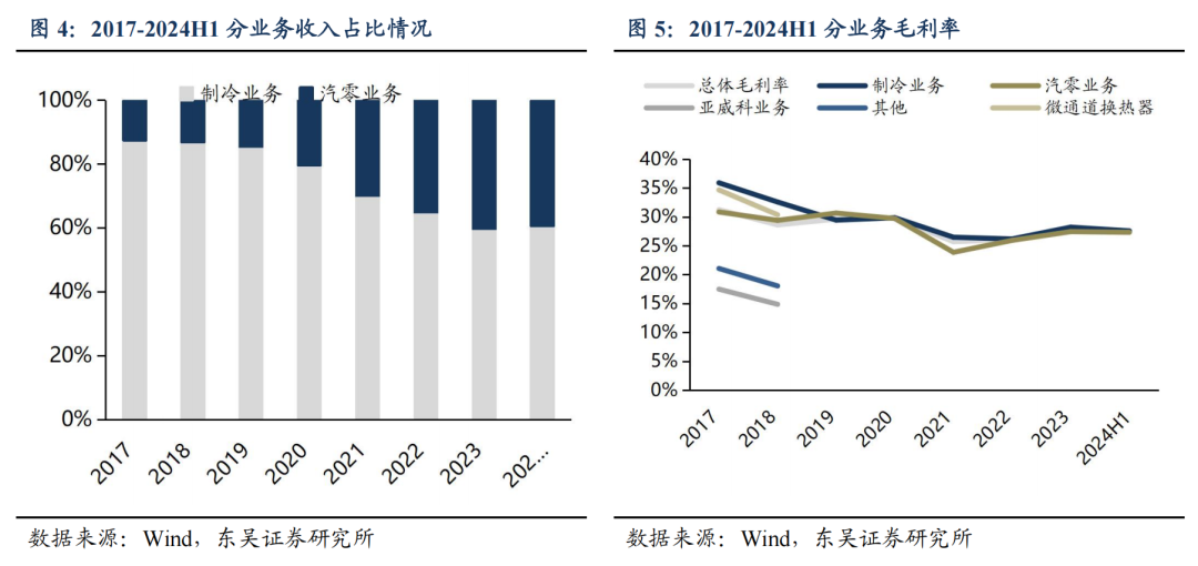 公司主营业务为机械电子控制部件和组件类产品的研发、生产和销售,根据产品应用领域分为制冷空调电器零部件和汽车零部件业务。制冷空调电器零部件致力于建筑暖通、电气设备专业化经营,汽车零部件业务专注于汽车热管理领域的深入研究。24H1汽零业务营收占比近40%,制冷、汽零业务毛利率均维持27% 。