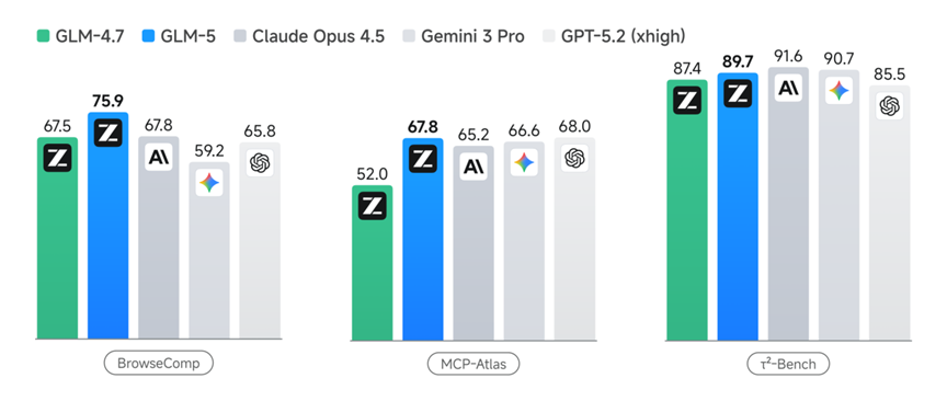 GLM-5在 Agent 能力上实现开源 SOTA,在多个评测基准中取得开源第一:在 BrowseComp(联网检索与信息理解)、MCP-Atlas(工具调用和多步骤任务执行)和 τ²-Bench(复杂多工具场景下的规划和执行)均取得最佳表现。