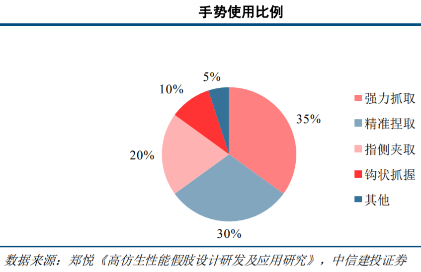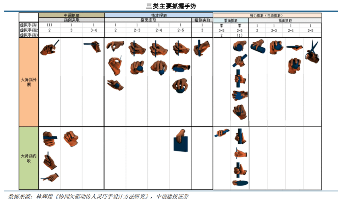 灵巧手凭借多自由度手指以及拇指额外的内/外旋运动可以良好实现强力抓取、精准捏取、中间抓取(三类手势动作使用比例达85%),满足大部分手部动作需求,能适应多种不同的对象和任务。