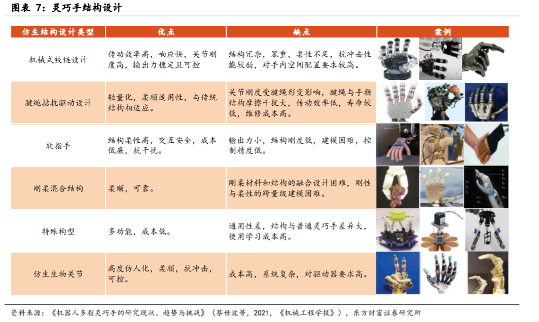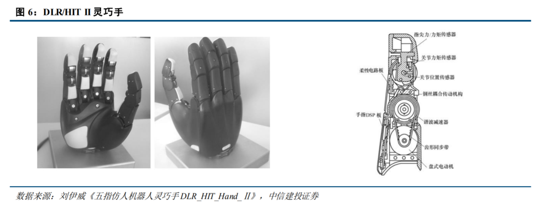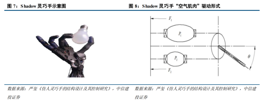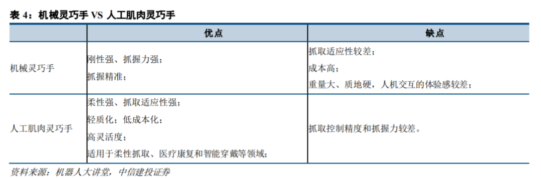 4.根据应用的材料和结构,灵巧手可分为机械灵巧手和人工肌肉灵巧手,机械灵巧手为目前主流方案,人工肌肉灵巧手柔性特点突出。