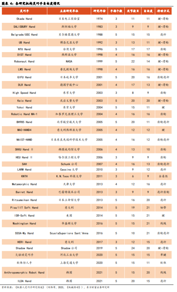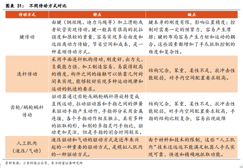 3.根据自由度与驱动源数量,灵巧手有全驱动和欠驱动两种方案,欠驱动得益于更简单的结构设计、更低的成本,应用更多。