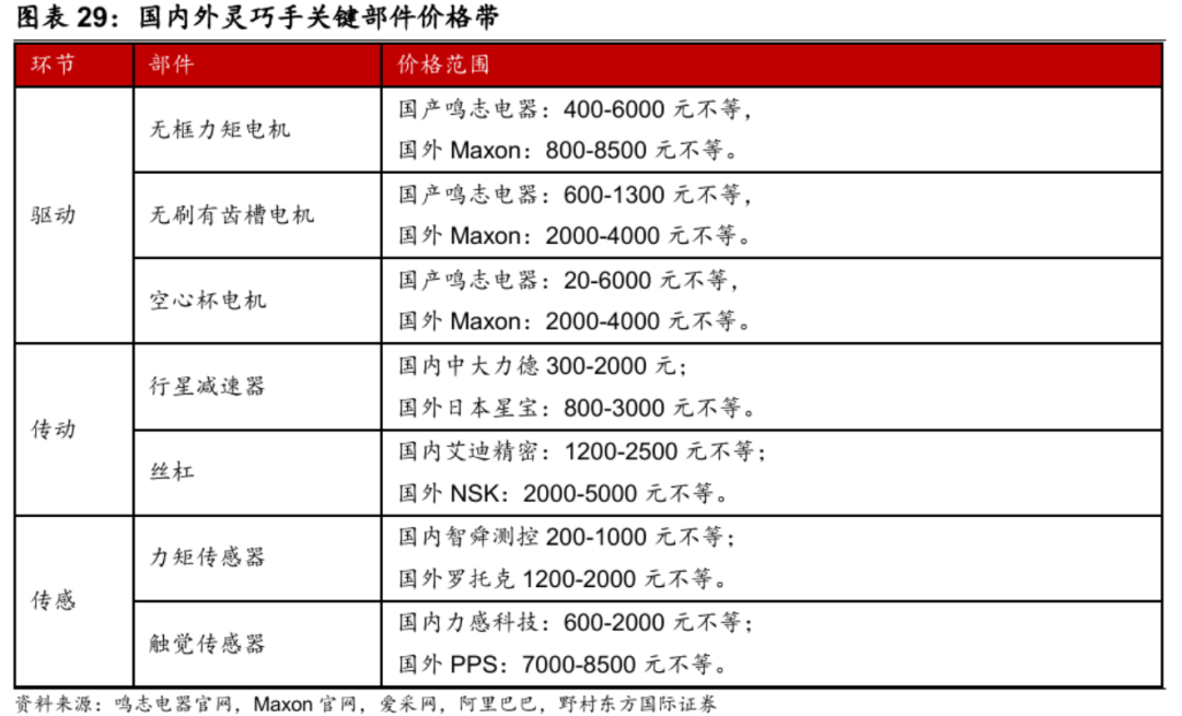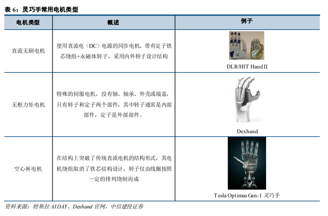 1)驱动:驱动系统是整个灵巧手的动力源,是手指输出力的来源。灵巧手按照位置分为驱动器内置、驱动器外置和混合式;电机类型包括空心杯电机、无刷有齿槽电机等,二者在性能和成本上各具优势;