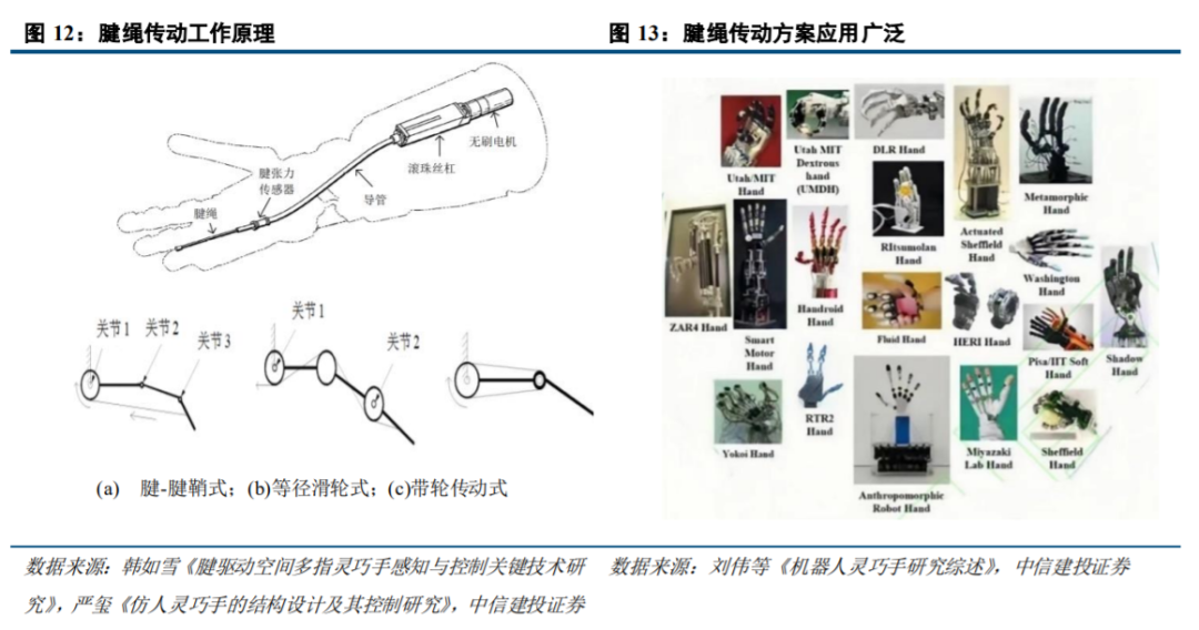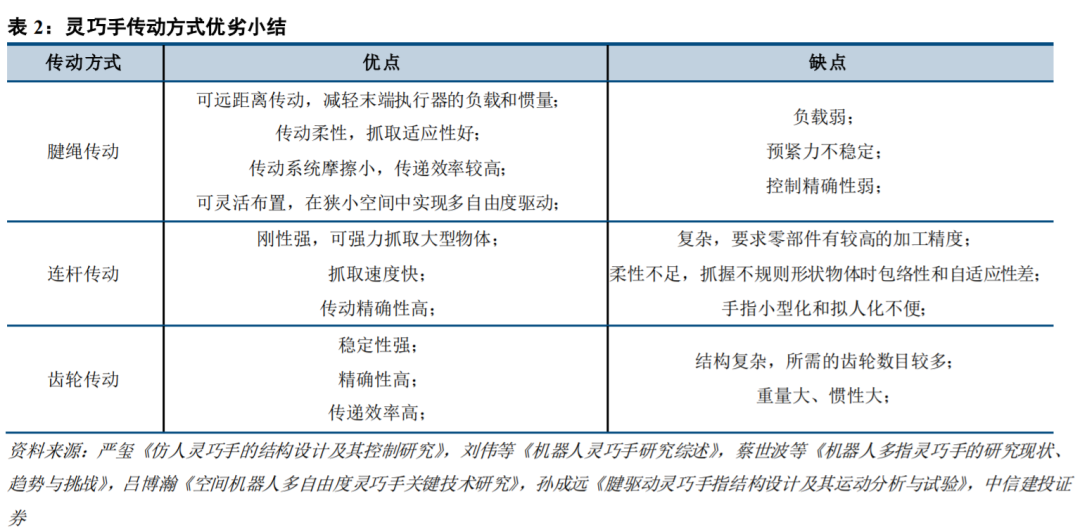 2)传动:电机需要搭配传动部件使用,将驱动器产生的运动合力以一定的方式传递到手指关节,从而使关节做相应的运动。传动方案路线较多,其中腱绳驱动、齿轮和丝杠为当前的主流技术方向,灵巧手通过采用多种传统方式组合应用。