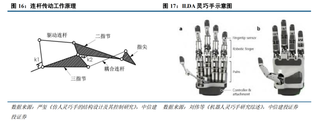 ②从运行特点看,相比腱绳结构,连杆结构刚性强,可以实现强力抓取大型物体,连杆传动还具有抓取速度快、传动精确性高的优点。