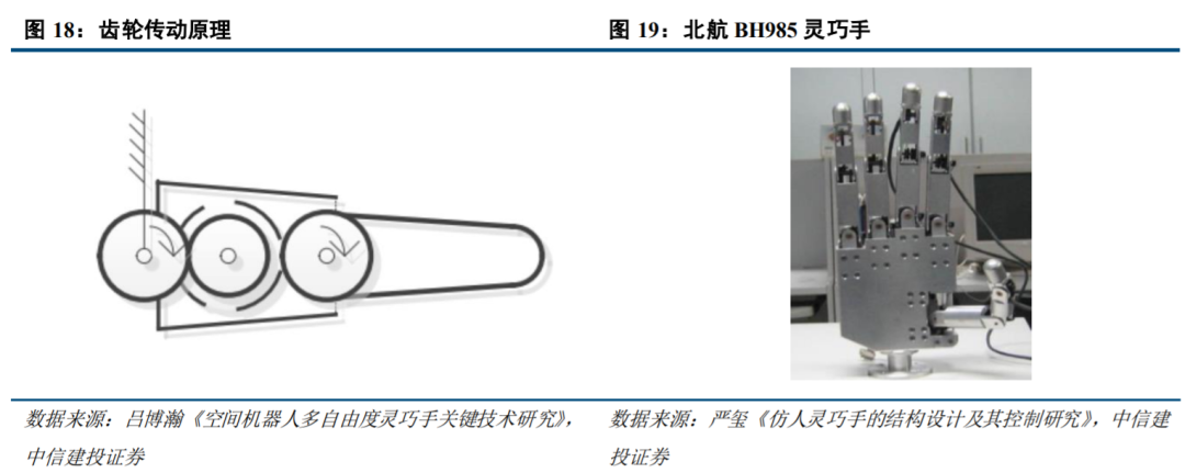 ③从典型案例看,代表有北航研制的BH985灵巧手,采用连杆 齿轮传动,体积和自重较大。