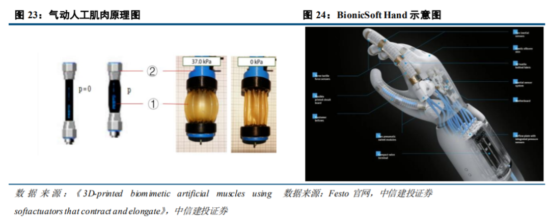 典型案例有 Festo 公司研发的 BionicSoft Hand,该款灵巧手共有 12 个自由度,没有任何骨骼,通过手指中的气动波纹管结构控制运动。当气室充满空气时,手指弯曲。